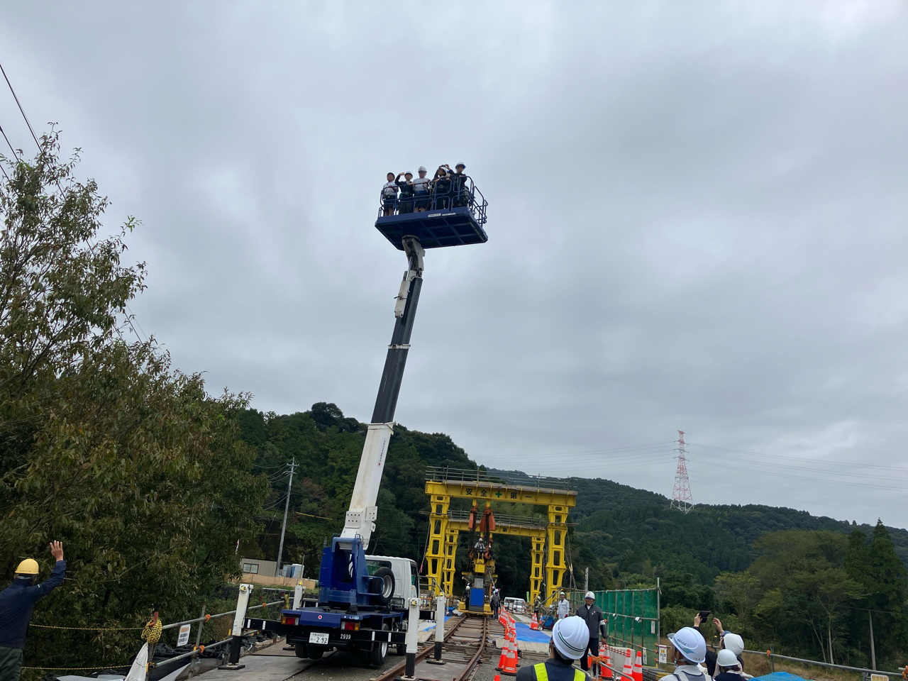 当日は、市内の小学校から児童27名が参加。現場では、橋の役割や施工手順、土木技術の工夫などをわかりやすく説明しました。さらに、高所作業車やドローンを活用した体験も実施し、普段は見ることのできない視点から工事を学んでもらいました。