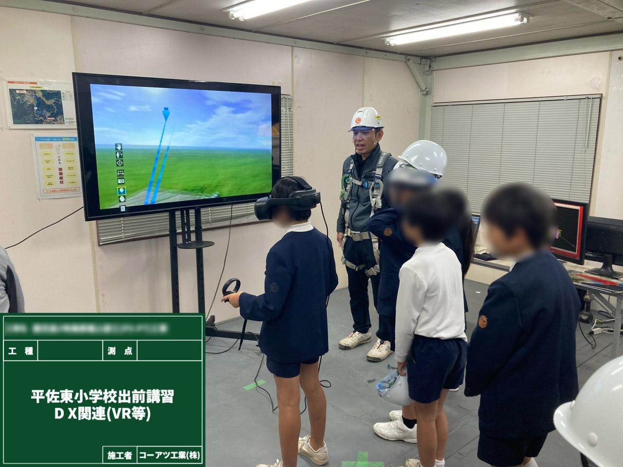 2025年11月、薩摩川内市で建設が進む「飯母(イボ)橋」にて、薩摩川内市立平佐東小学校の児童のみなさんを招いた橋づくりの現場見学会を実施しました。「体験型ブースラリー」として、VRで橋の上からの景色を体験したり、3D測量に触れたり、高所作業車に乗って現場を見渡したりと、実際の仕事に近い内容を用意しました。児童からは「高所作業車で高いところに上がれてよかった」「VRで橋の高いところから見た景色がおもしろかった」といった感想が寄せられました。